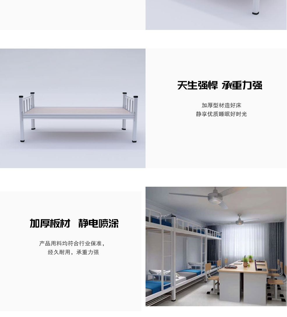 二連3人位公寓床1.整體規格:L4110*W900*H2120mm/2900mm,;2.邊立柱:采用(V65閉口型材),料厚1.2mm的閉口型管材,立面8個。立柱上下兩端口安裝工程塑料靜音內塞,上端內塞...
