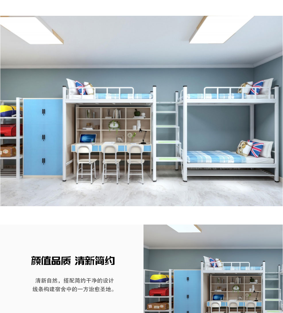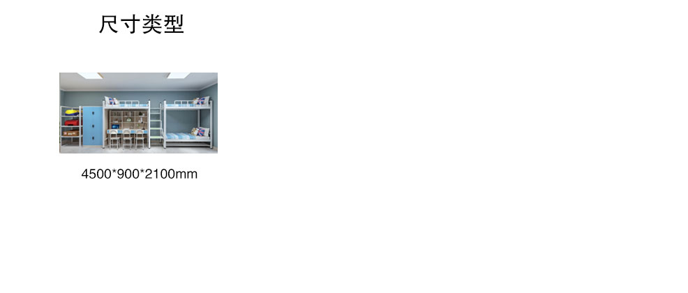 二連3人位公寓床1.整體規(guī)格:L4110*W900*H2120mm/2900mm,;2.邊立柱:采用(V65閉口型材),料厚1.2mm的閉口型管材,立面8個。立柱上下兩端口安裝工程塑料靜音內(nèi)塞,上端內(nèi)塞...