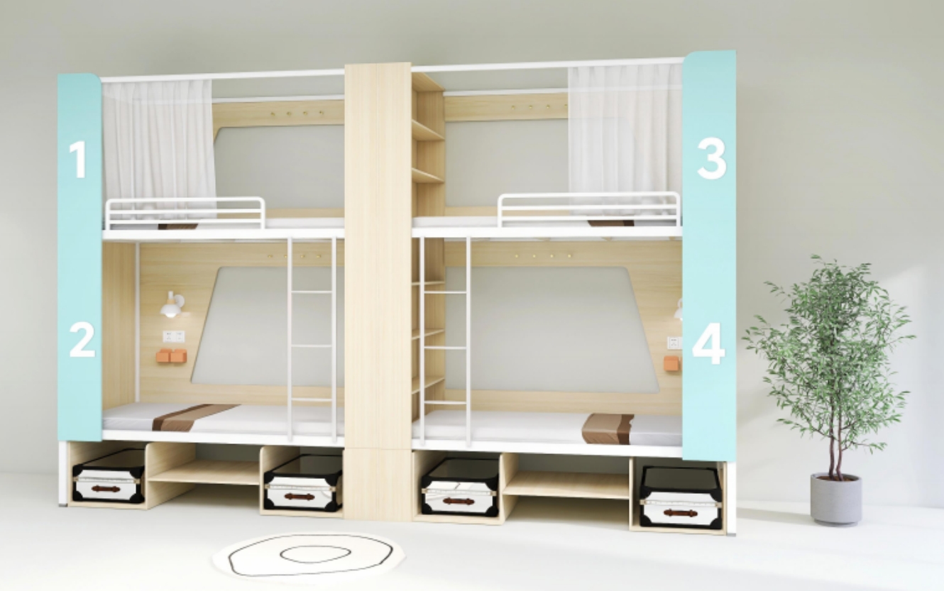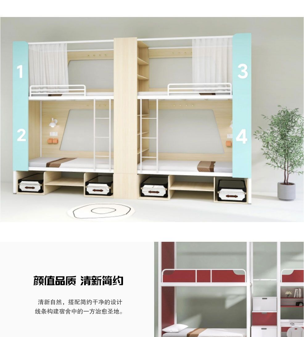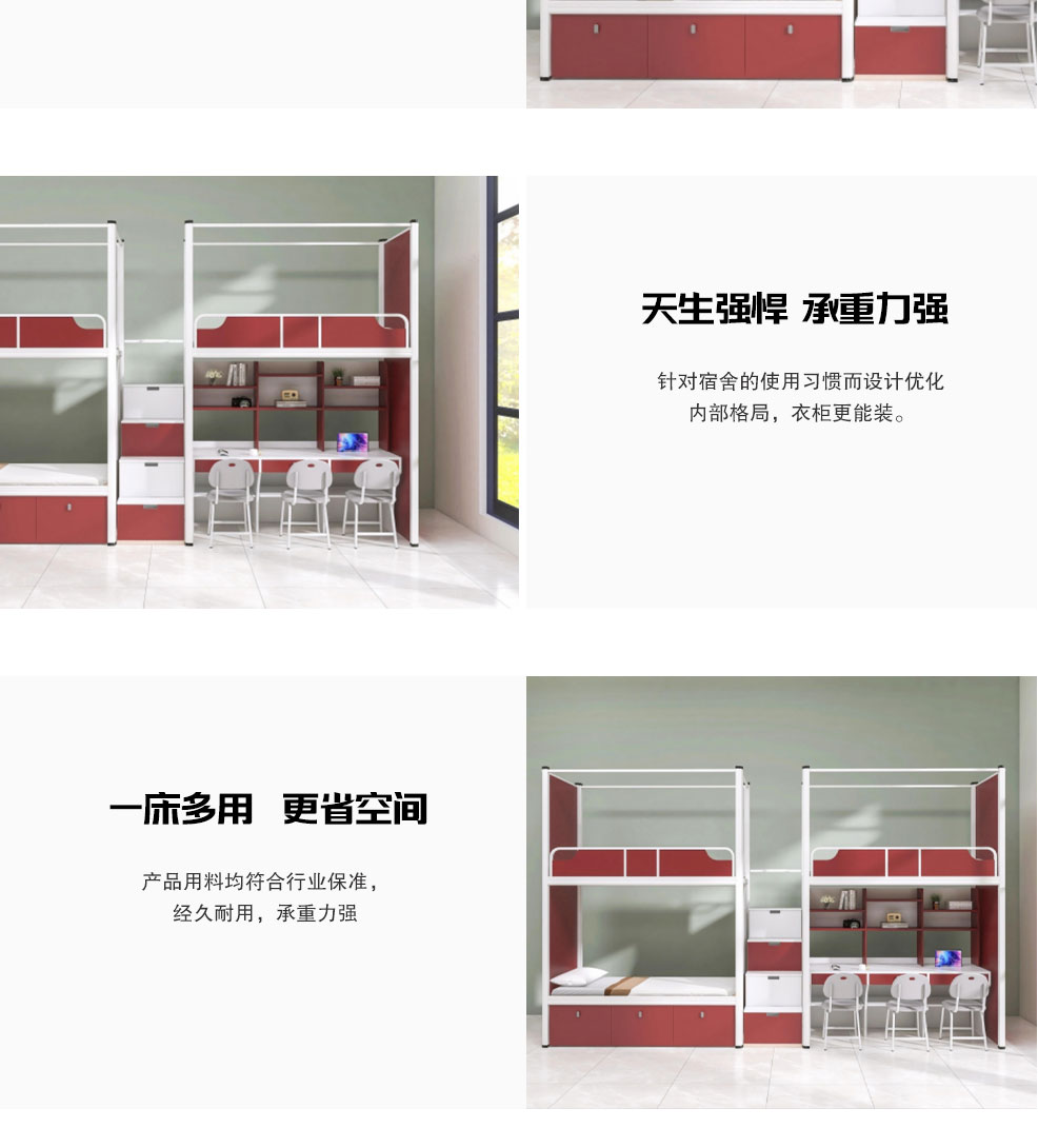二連3人位公寓床1.整體規(guī)格:L4110*W900*H2120mm/2900mm,;2.邊立柱:采用(V65閉口型材),料厚1.2mm的閉口型管材,立面8個。立柱上下兩端口安裝工程塑料靜音內(nèi)塞,上端內(nèi)塞...